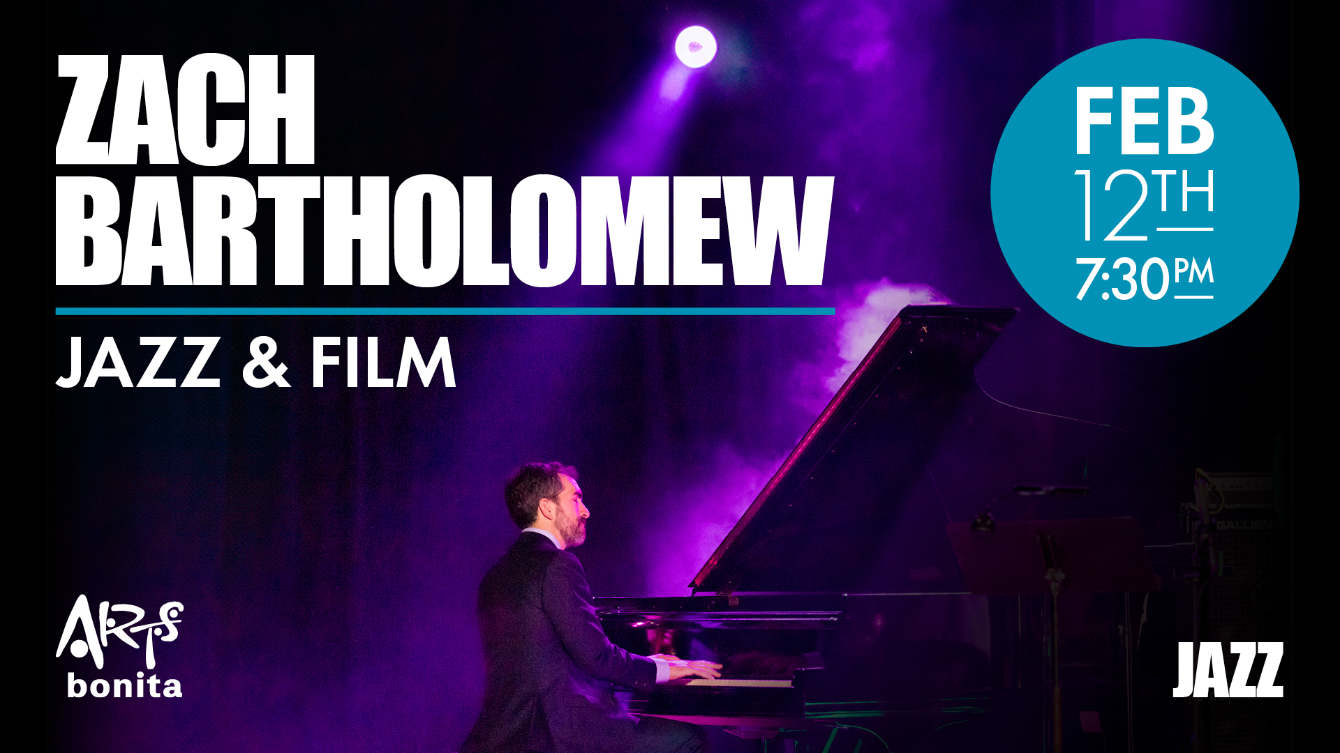 Step into the spotlight for a one-of-a-kind musical experience where the magic of jazz meets the glamour of the big screen! Acclaimed jazz pianist Dr. Zachary Bartholomew brings his signature energy, storytelling, and virtuosity to Arts Bonita in “Jazz and Film,” a thrilling concert that celebrates the unforgettable jazz moments that have graced the silver screen and television.